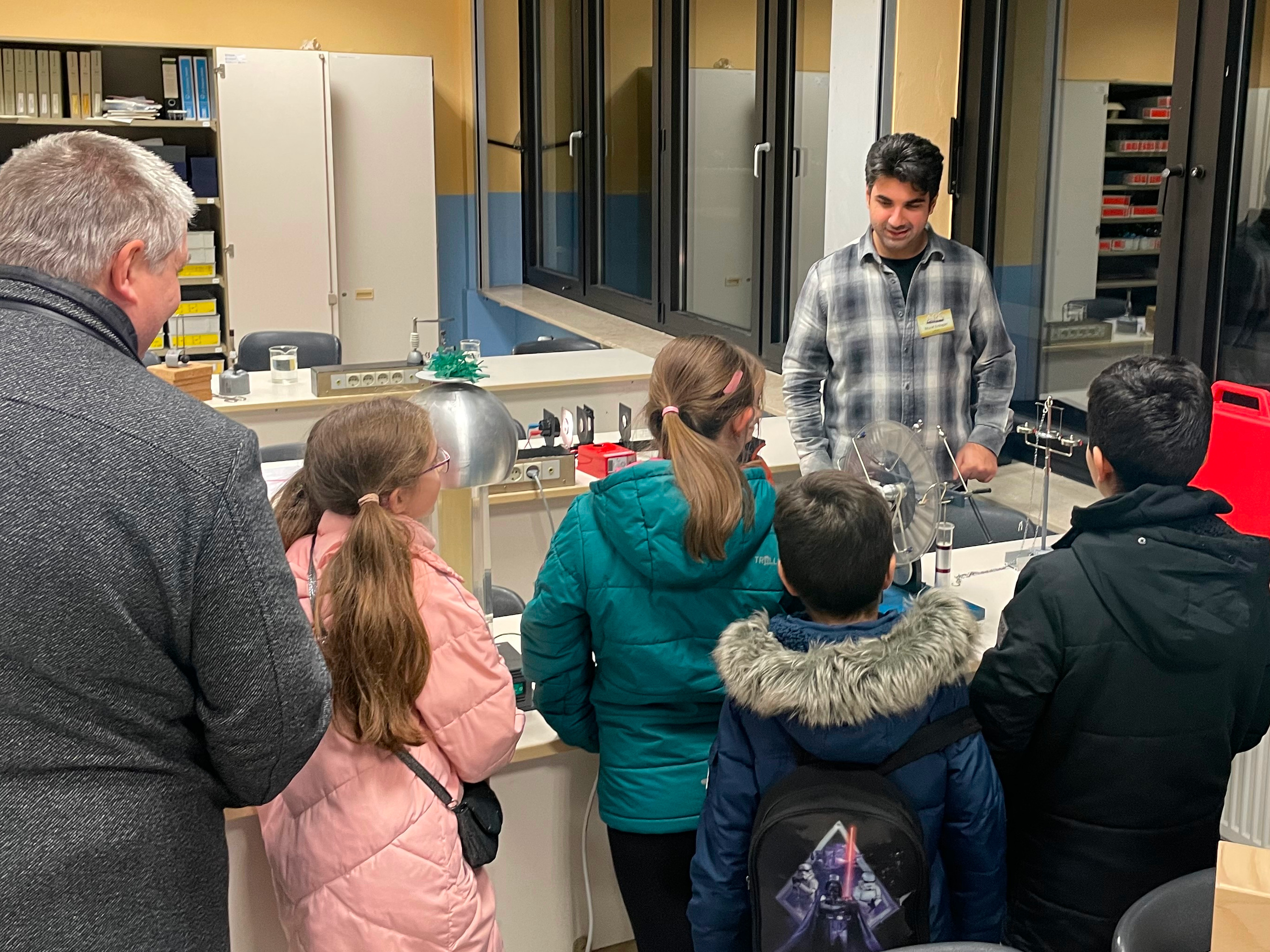 Zahlreich besucht waren auch die Naturwissenschaften Biologie, Chemie und Physik im oberen Stockwerk. So schauten sich die Gäste an den Mikroskopen unter anderem Vergrößerungen von Herzmuskelzellen an. Ein lernbegieriges Publikum konnte auch im Chemieraum verzeichnet werden, in dem mit dem Verfahren der sogenannten Papierchromatographie gezeigt wurde, wie man aus den drei Grundfarben gelb, rot und blau andere Farben entstehen lassen konnte. „Hochspannung – Vorsicht Lebensgefahr“ hieß es schließlich an einigen Experimentierstationen des Fachbereiches Physik.