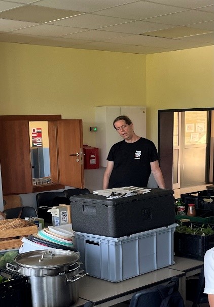 Ziel des Vormittags: bewusster Umgang mit Lebensmitteln und ein praktischer Beitrag gegen die Lebensmittelverschwendung. Hugh, der seit Jahren in Deutschland lebt und mit seiner mobilen „Küfa“ (Küche für alle) unter anderem Bildungsprojekte durchführt, brachte nicht nur die Lebensmittel und Zutaten, sondern auch viel Knowhow mit in die Schulküche.