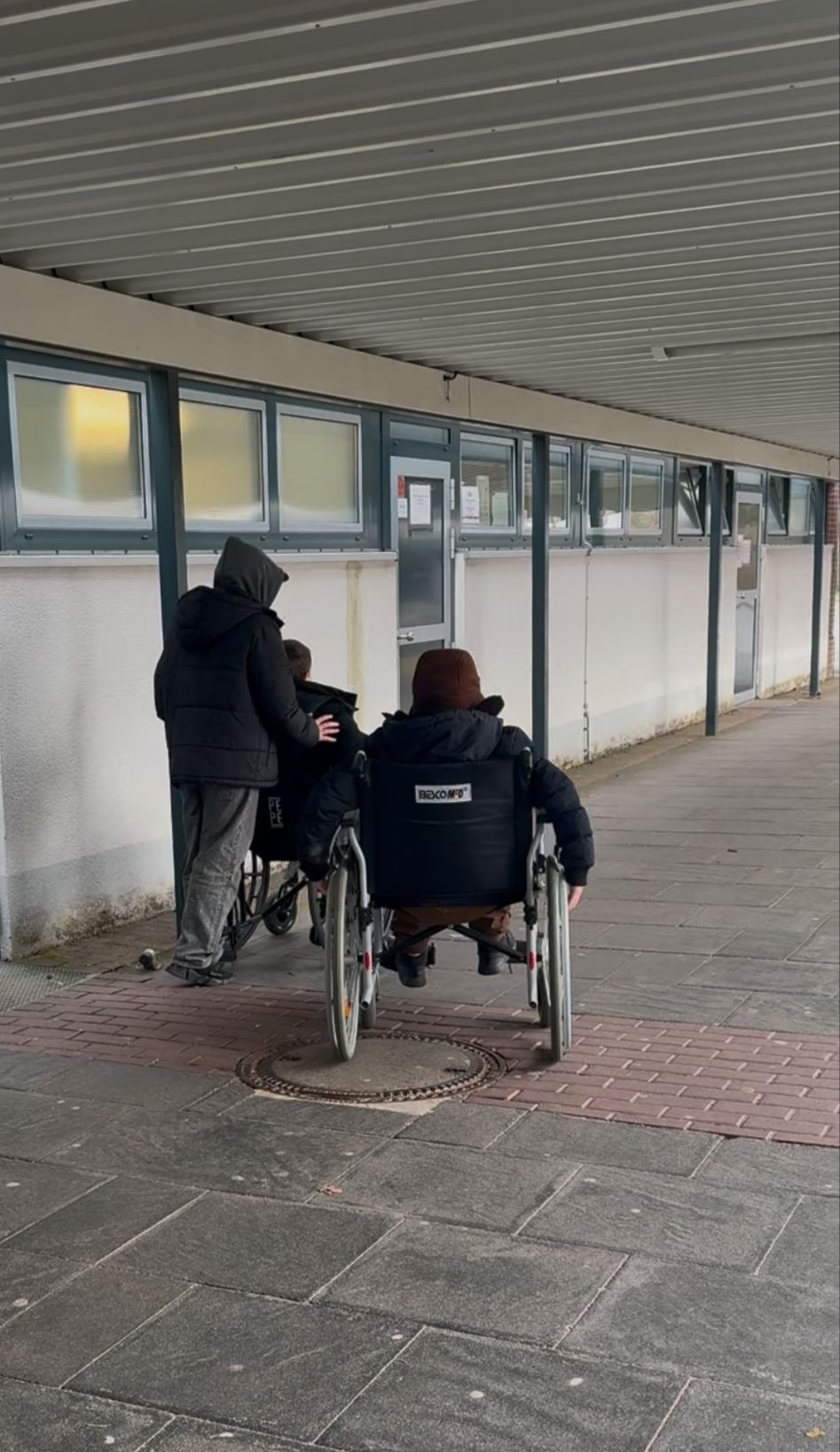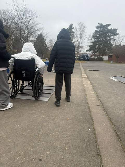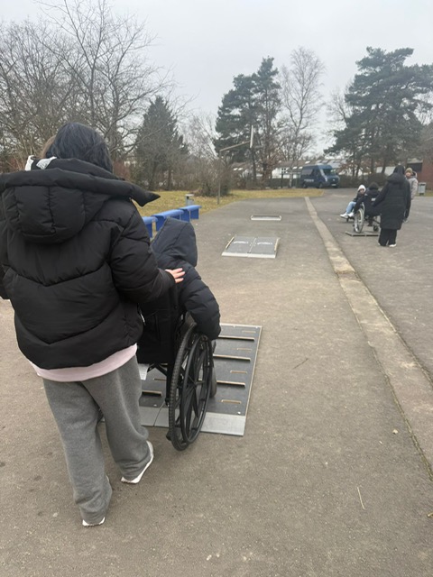 Ein Höhepunkt des Tages war der Rollstuhlparcours, in dem die Schülerinnen und Schüler selbst ausprobieren konnten, wie schwierig es sein kann, sich im Alltag fortzubewegen, wenn man auf einen Rollstuhl angewiesen ist. Hindernisse wie Bordsteinkanten und Kopfsteinpflaster wurden so zu echten Herausforderungen, die den Jugendlichen eindrucksvoll vor Augen führten, wie wichtig Barrierefreiheit ist.