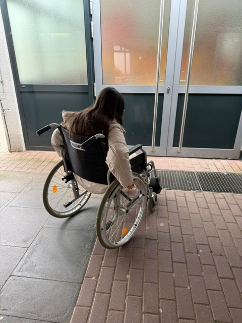 Im Anschluss begaben sich die Schülerinnen und Schüler auf eine Entdeckungsreise durch die Schule, um die Barrierefreiheit zu überprüfen. Dabei konnten sie durch praktische Übungen nachempfinden, wie sich blinde Menschen, Rollstuhlfahrer und Personen nach einem Schlaganfall in ihrer Umgebung fühlen. Diese Erfahrung machte den Jugendlichen deutlich, wie schnell man die Orientierung verlieren und sich unsicher fühlen kann.